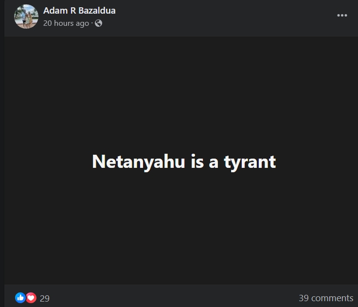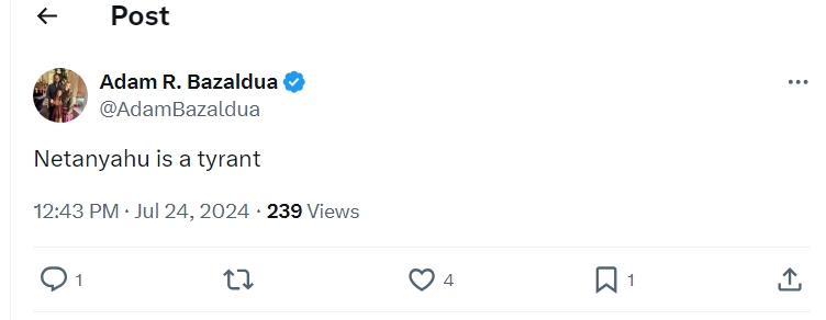 Adam Bazaldua, the two-term incumbent representing District 7, made a pithy offering on X: “Netanyahu is a tyrant.” A post from Bazaldua on Facebook was identical.