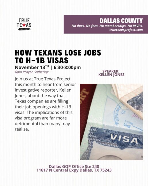 Jones’ talk, titled “How Texans Lose Jobs to H-1B Visas,” will explore how major Texas employers, including Cognizant, Tesla, Charles Schwab & Co., have used the visa program to fill job openings traditionally held by U.S. workers, according to the group’s event listing.