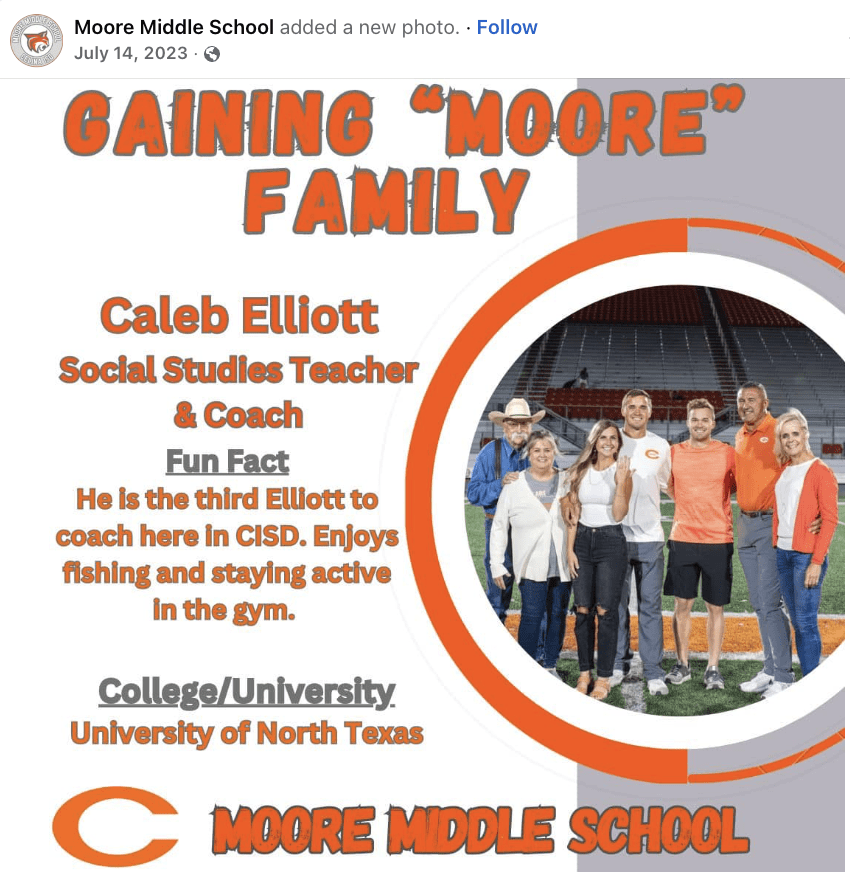 Caleb Elliott is a 6th-grade teacher and 8th-grade coach at Moore Middle School, where he has worked since 2023.