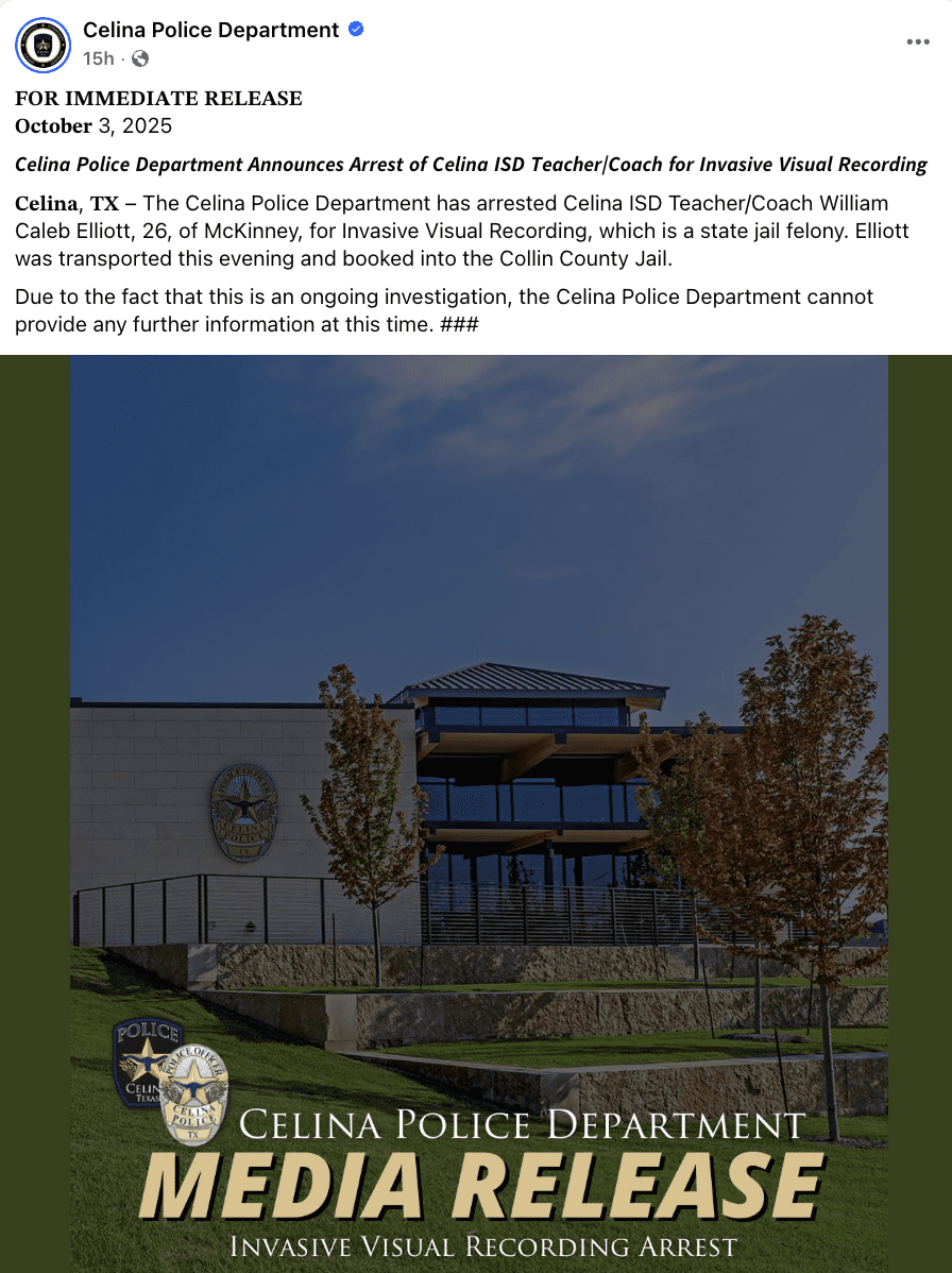 (Texas Scorecard) – Police arrested a middle school teacher and coach in Celina Independent School District who allegedly recorded visual images of students’ intimate areas without their knowledge.