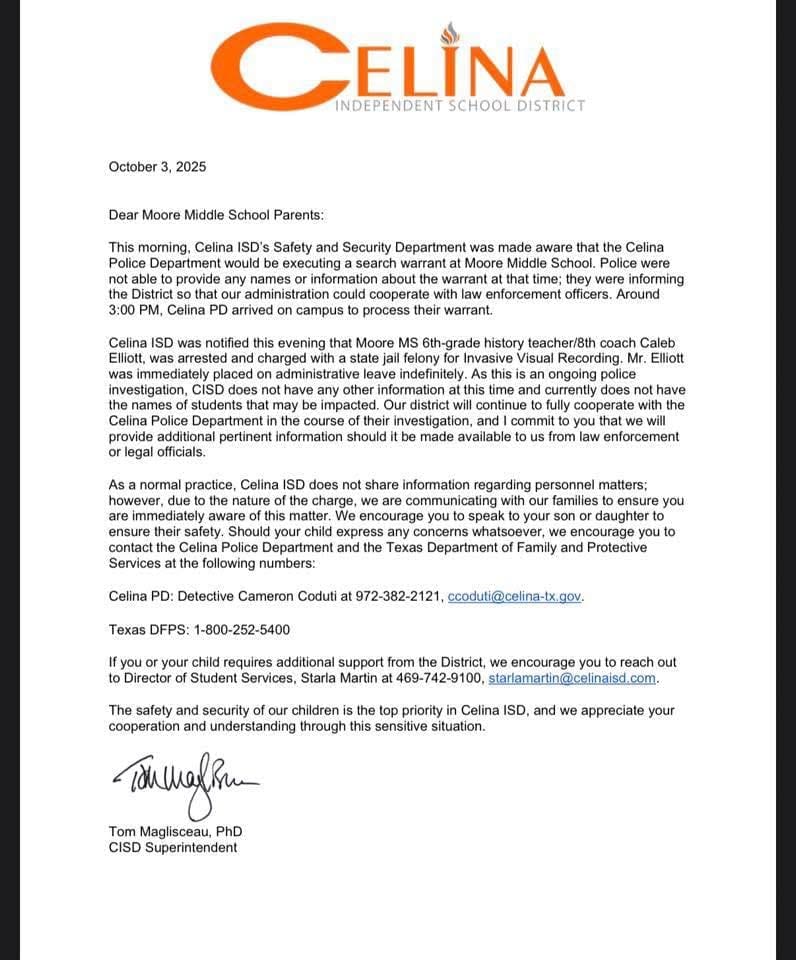 Superintendent Tom Maglisceau notified Moore Middle School parents on Friday that Celina police had executed a warrant on the campus around 3:00 p.m. and later arrested Elliott.