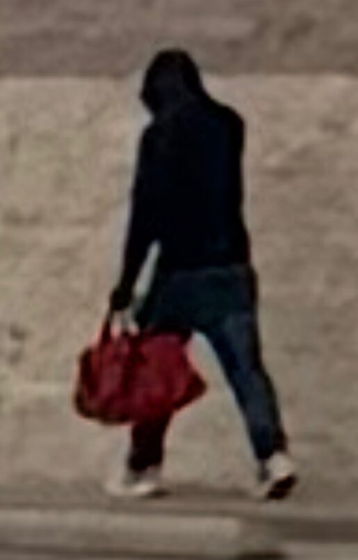 The suspect is a male in a dark sweatshirt, blue jeans, and white shoes. He was wearing a face mask at the time and carrying a bright red duffel bag.