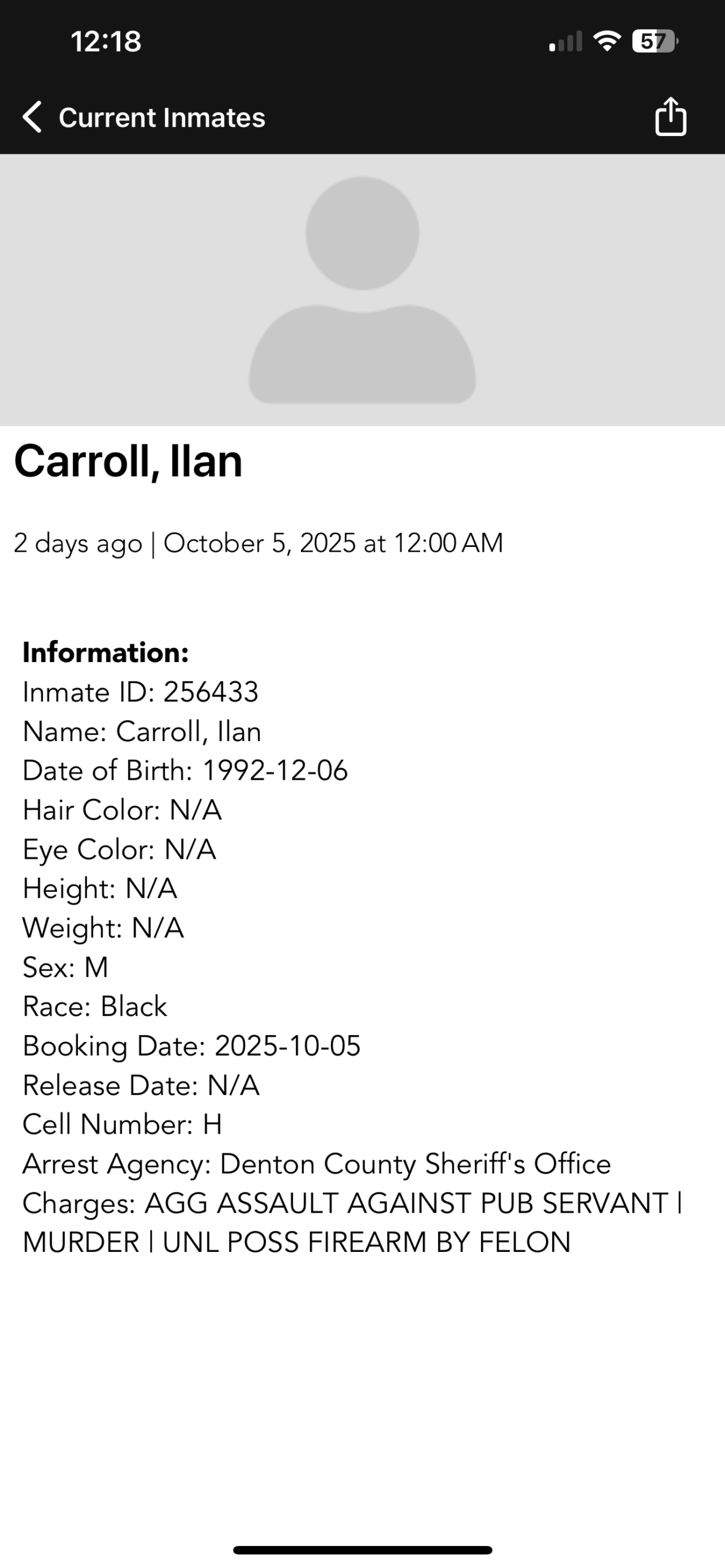 Ilan Carroll, 32, was taken into custody around midnight on October 5, according to county records. He faces charges of murder, aggravated assault against a public servant, and unlawful possession of a firearm by a felon.