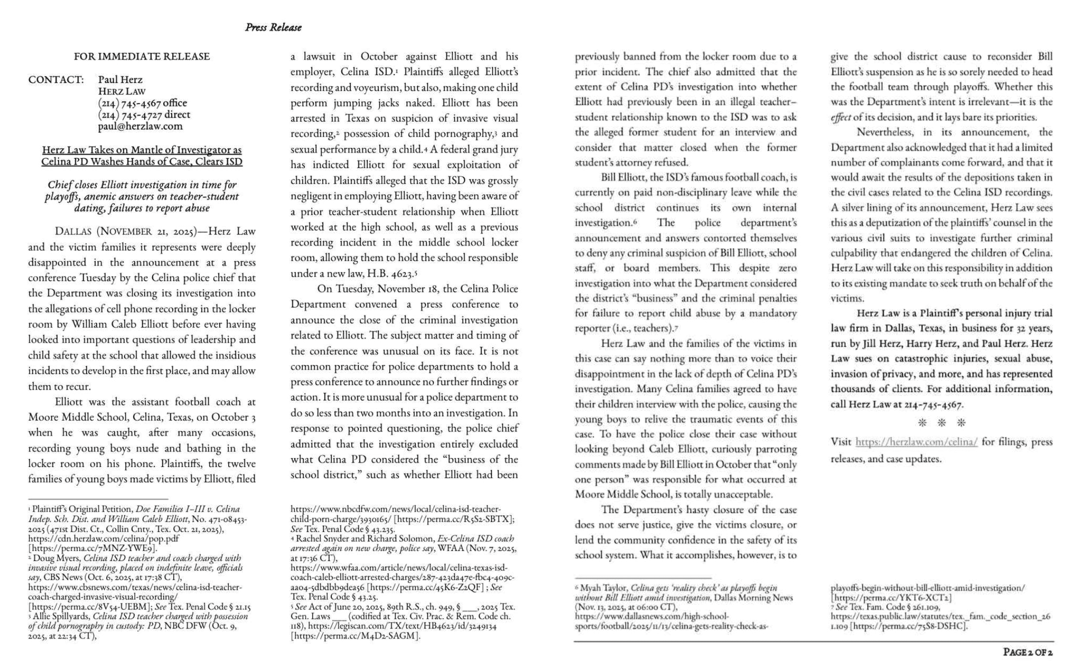 Last week, the Celina Police Department announced it had concluded its criminal investigation into Caleb Elliott. Paul Herz, the attorney representing families in the first filed lawsuit, called the department’s “hasty” closure of the case “unacceptable” but said his firm would continue to investigate.