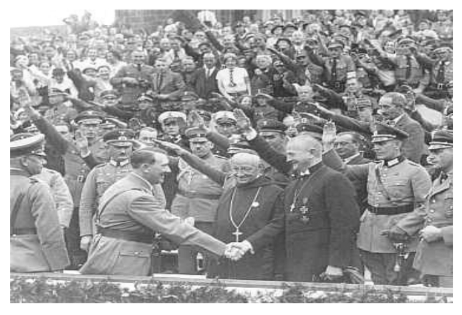 He pointed to a picture of Adolf Hitler shaking hands with regime clergy, from “The Christian Persecutory Impulse,” a book that blames Christianity for religious persecution.