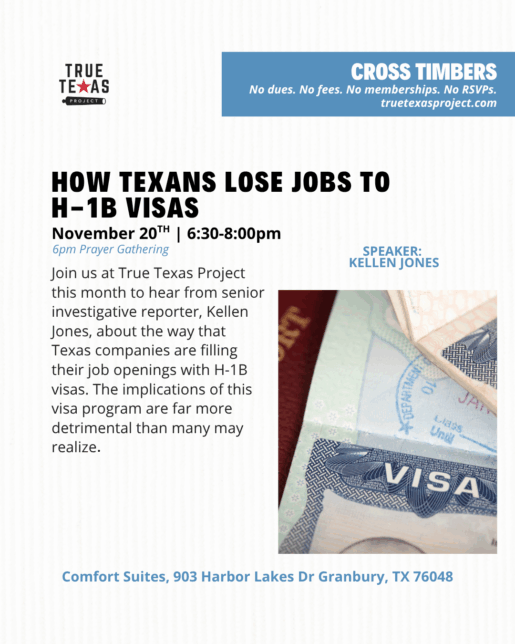 In Granbury, Jones will headline the November 20 Cross Timbers Monthly Meeting, also hosted by the True Texas Project. That forum’s flyer features substantially similar language regarding the H-1B program and its alleged effects on Texas workers and public services. The meeting will be held at the Comfort Suites on Harbor Lakes Drive (903 Harbor Lakes Dr, Granbury, TX 76048), with a public prayer gathering at 6:00 p.m. followed by the program at 6:30 p.m.