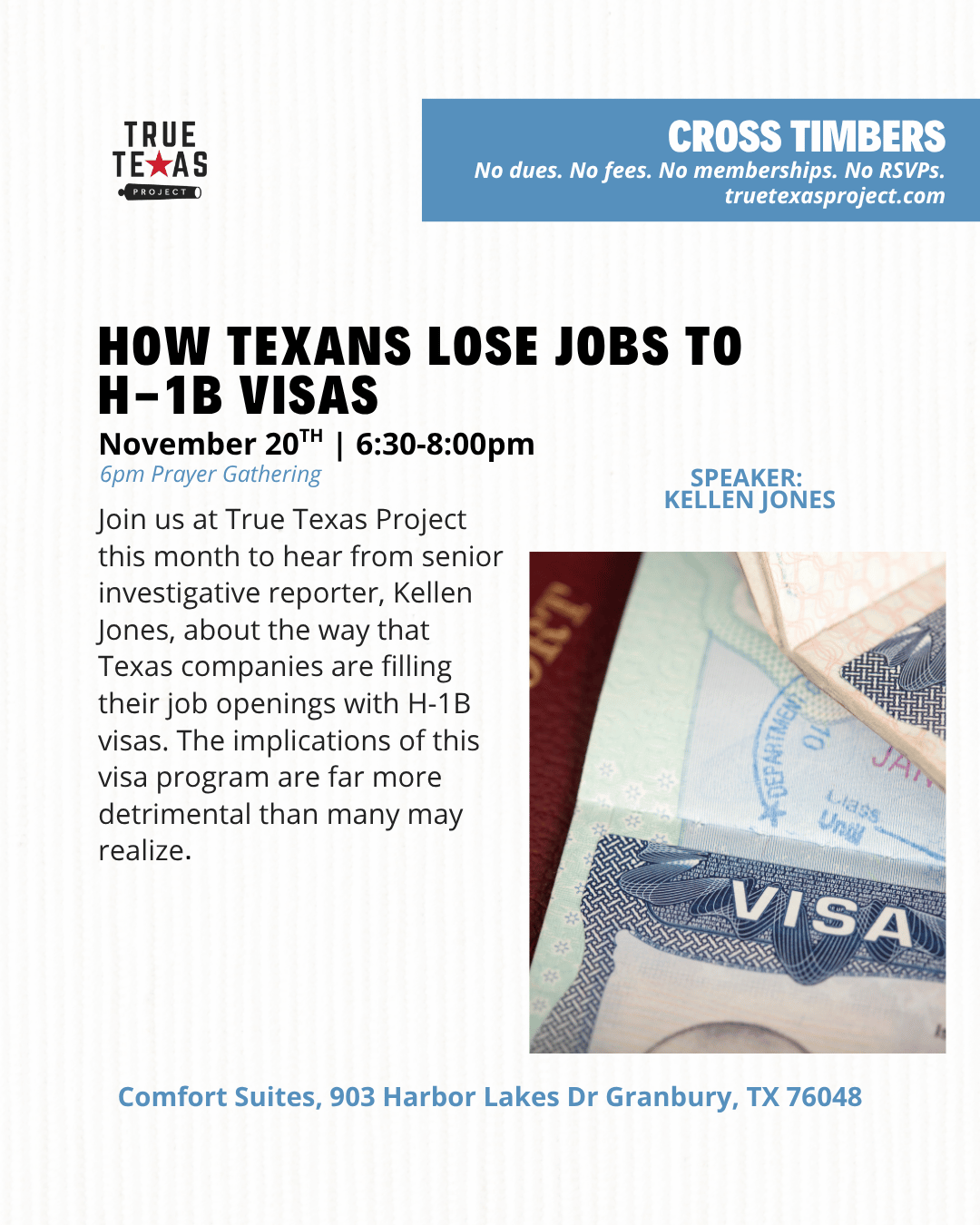 In Granbury, Jones will headline the November 20 Cross Timbers Monthly Meeting, also hosted by the True Texas Project. That forum’s flyer features substantially similar language regarding the H-1B program and its alleged effects on Texas workers and public services. The meeting will be held at the Comfort Suites on Harbor Lakes Drive (903 Harbor Lakes Dr, Granbury, TX 76048), with a public prayer gathering at 6:00 p.m. followed by the program at 6:30 p.m.