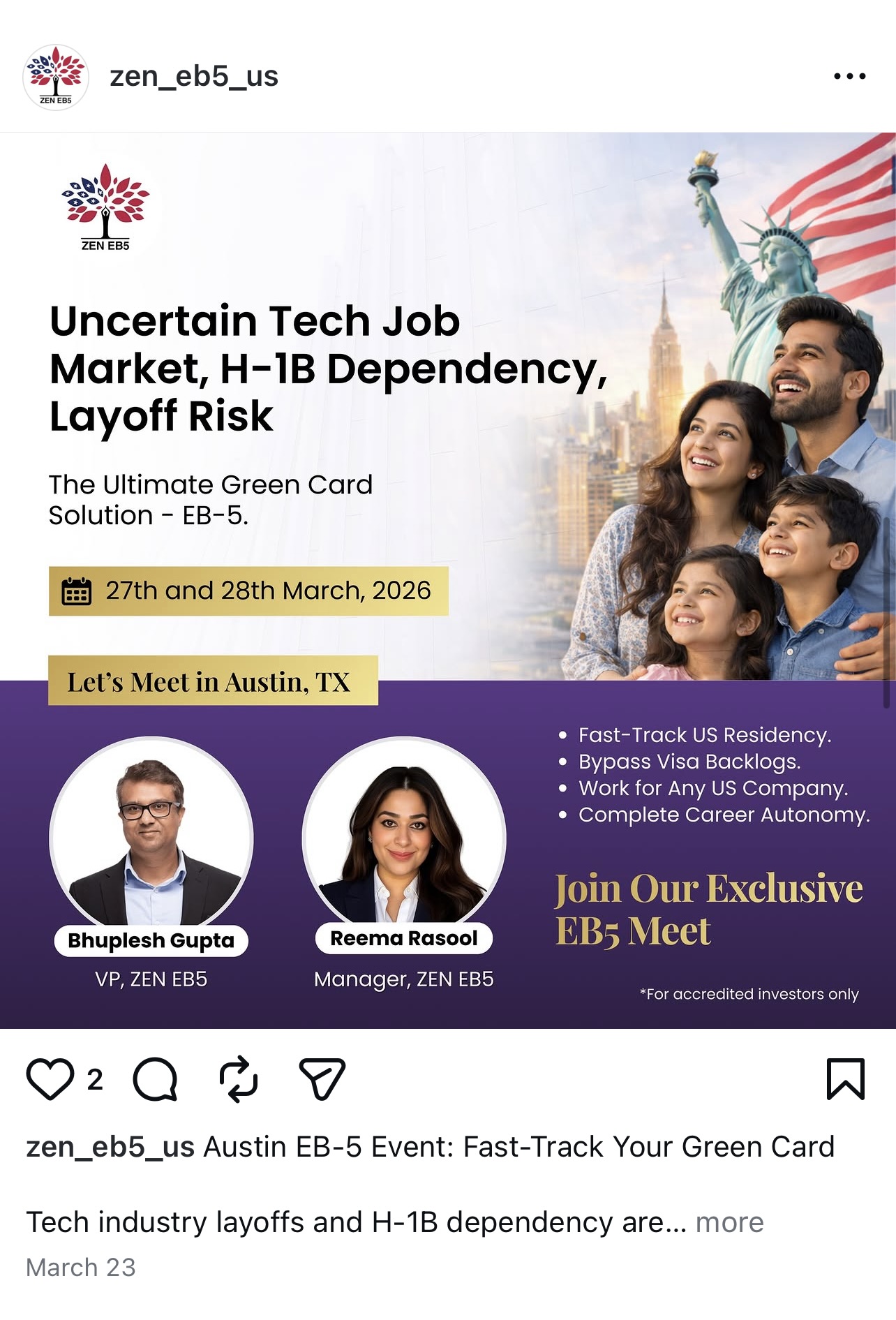 Additional promotions invited prospective investors to a March EB-5 event held in Austin, where company representatives pitched the program as “The Ultimate Green Card Solution” amid tech layoffs and visa uncertainty.