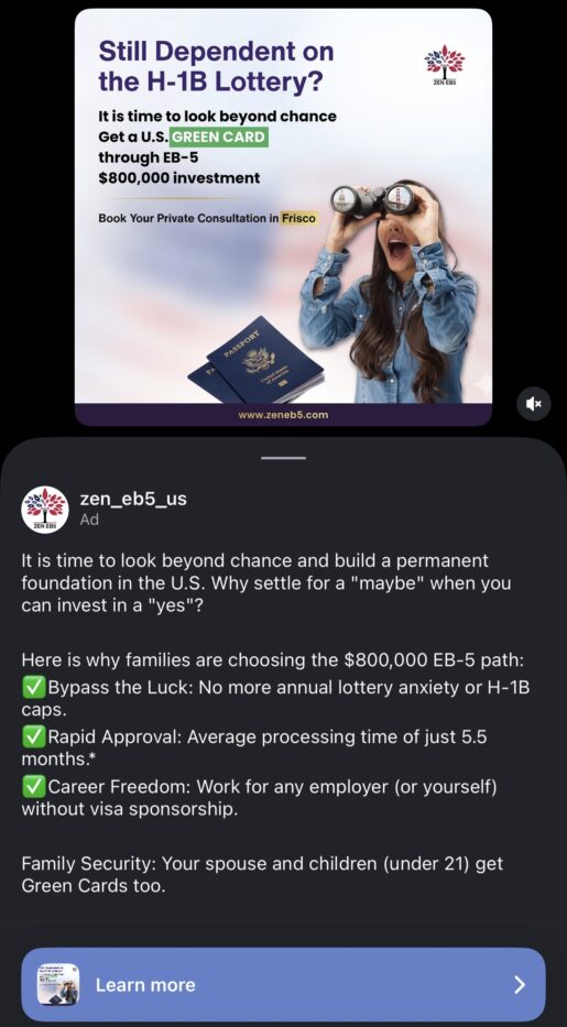 One recent Instagram ad from Zen EB5, a company that specializes in immigration-related investments, features what appears to be an Asian woman looking through binoculars reflecting images of Washington, D.C., and San Francisco, alongside the message: “Still Dependent on the H-1B Lottery? It is time to look beyond chance.” Another depicts a smiling Indian family posed in front of the Statue of Liberty and an American flag.