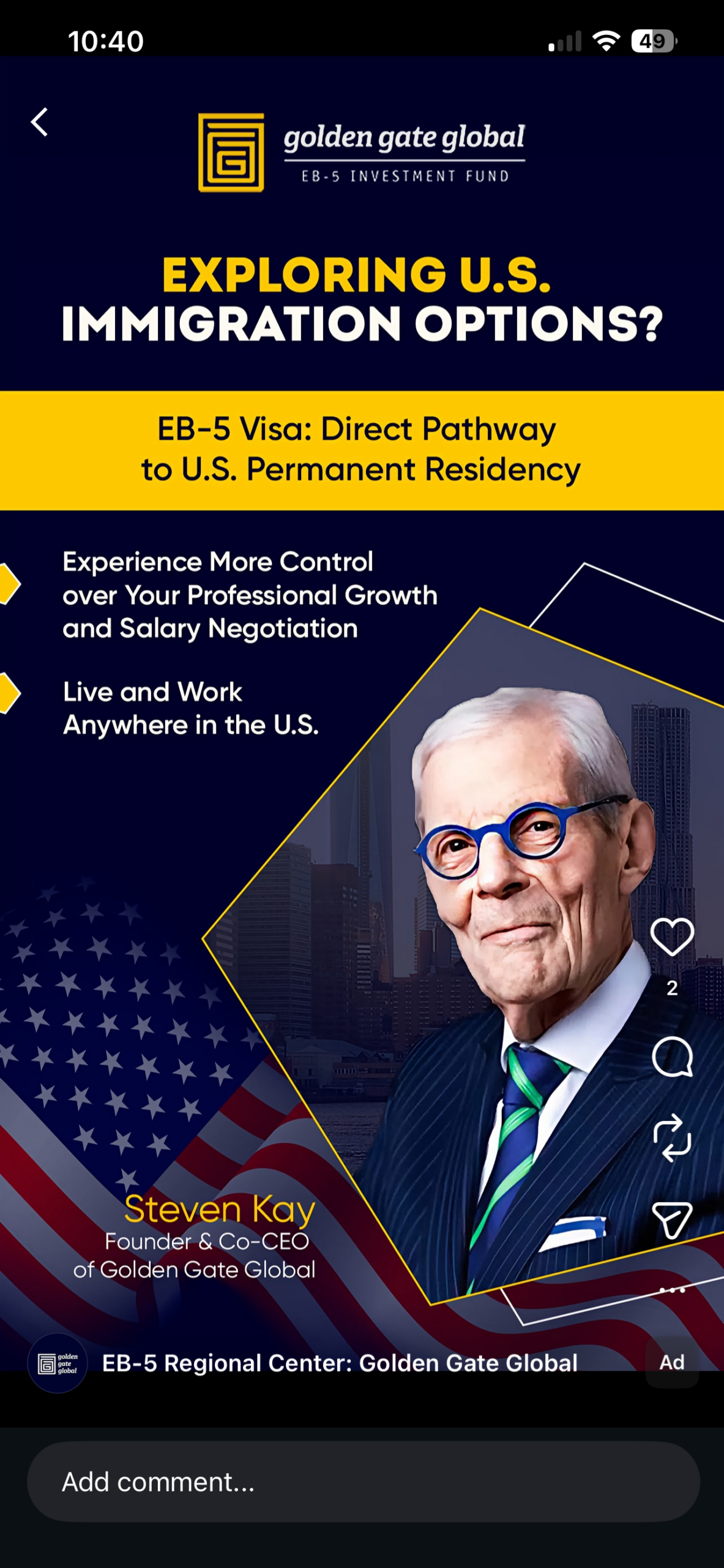 Other firms are using similar messaging. Ads from EB-5 Regional Center Golden Gate Global highlight that the visa allows applicants to “Experience More Control over Your Professional Growth and Salary Negotiation,” implicitly contrasting it with employer-sponsored visas.