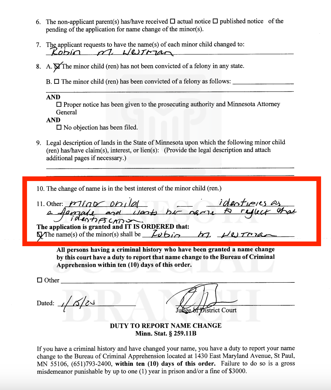 “Minor child identifies as a female and wants her name to reflect that identification,” reads the order granting the name change.