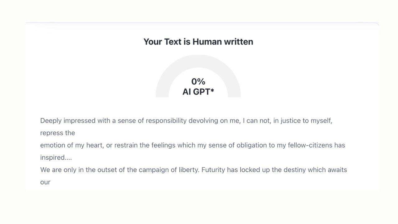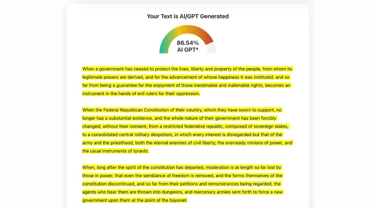 ZeroGPT, one of several widely used AI detectors, reported that the historic founding document of the Republic of Texas, the Texas Declaration of Independence, was 86.54% AI GPT. This means that it was flagged as being nearly 90% written with the assistance of artificial intelligence, even though the document was authored almost two centuries before the public release of AI language models.