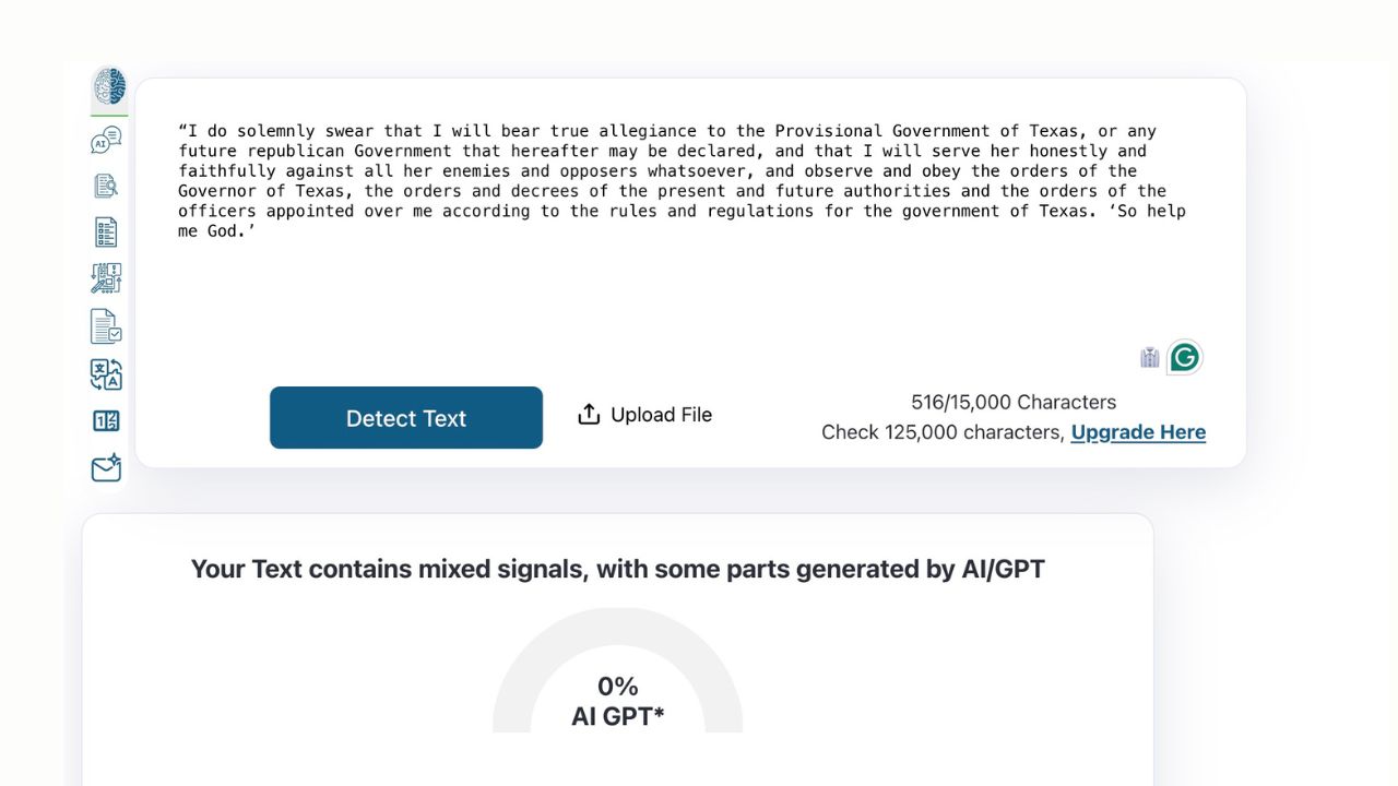 Yet the tool hedged when DX fed it the oath Davy Crockett and other volunteers took at Nacogdoches. Though the oath was rated at 0% AI GPT, the result warned the text contained mixed signals, suggesting AI GPT may have generated parts.